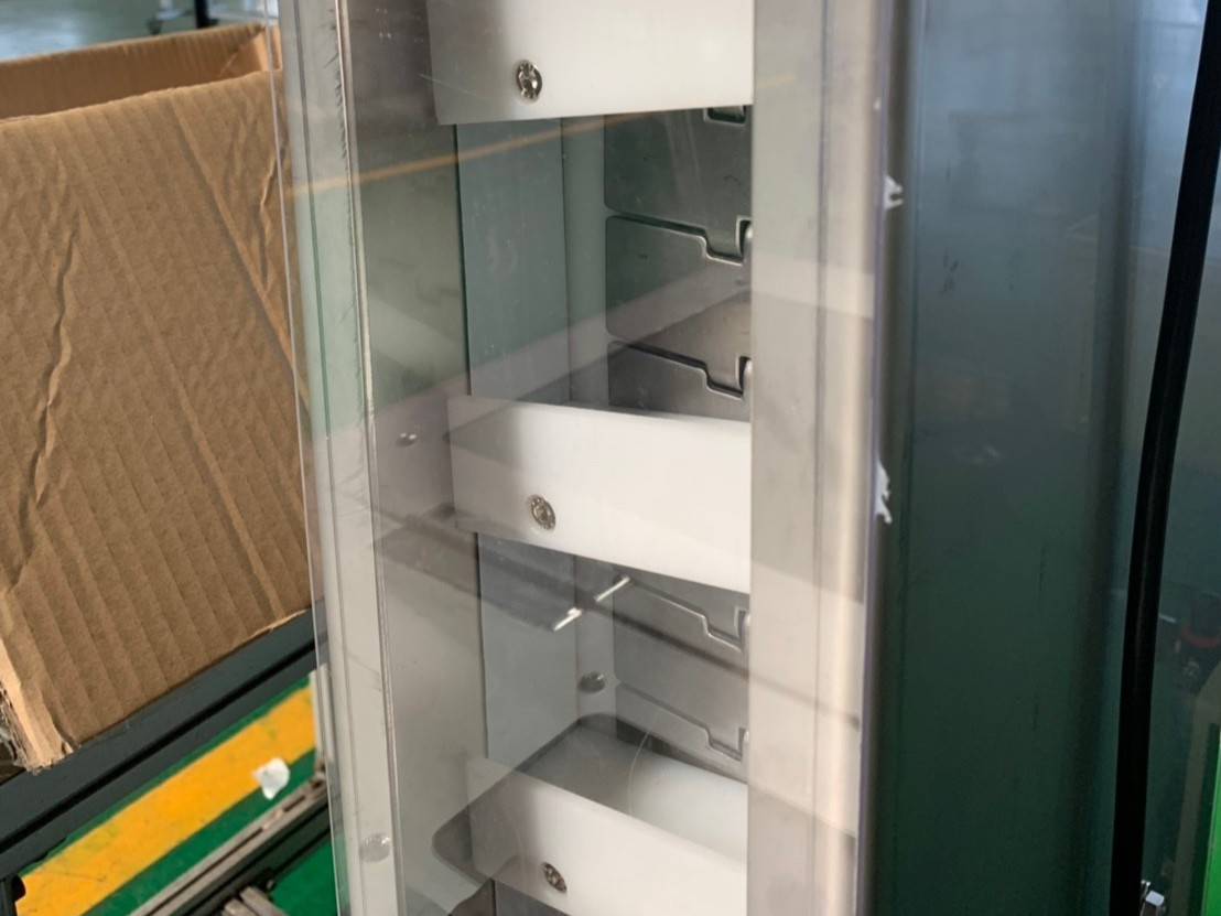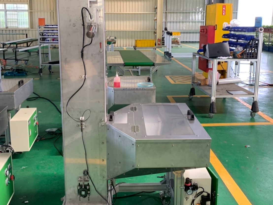 透過輸送帶儲存槽設計讓高爾夫球成品透過輸送帶將高爾夫球一顆一顆帶上來;且成品需要預防碰撞,故使用工程塑膠來保護客戶的工件,輸送帶出口末端還附上計數器便於與後端包裝機做連結使用。