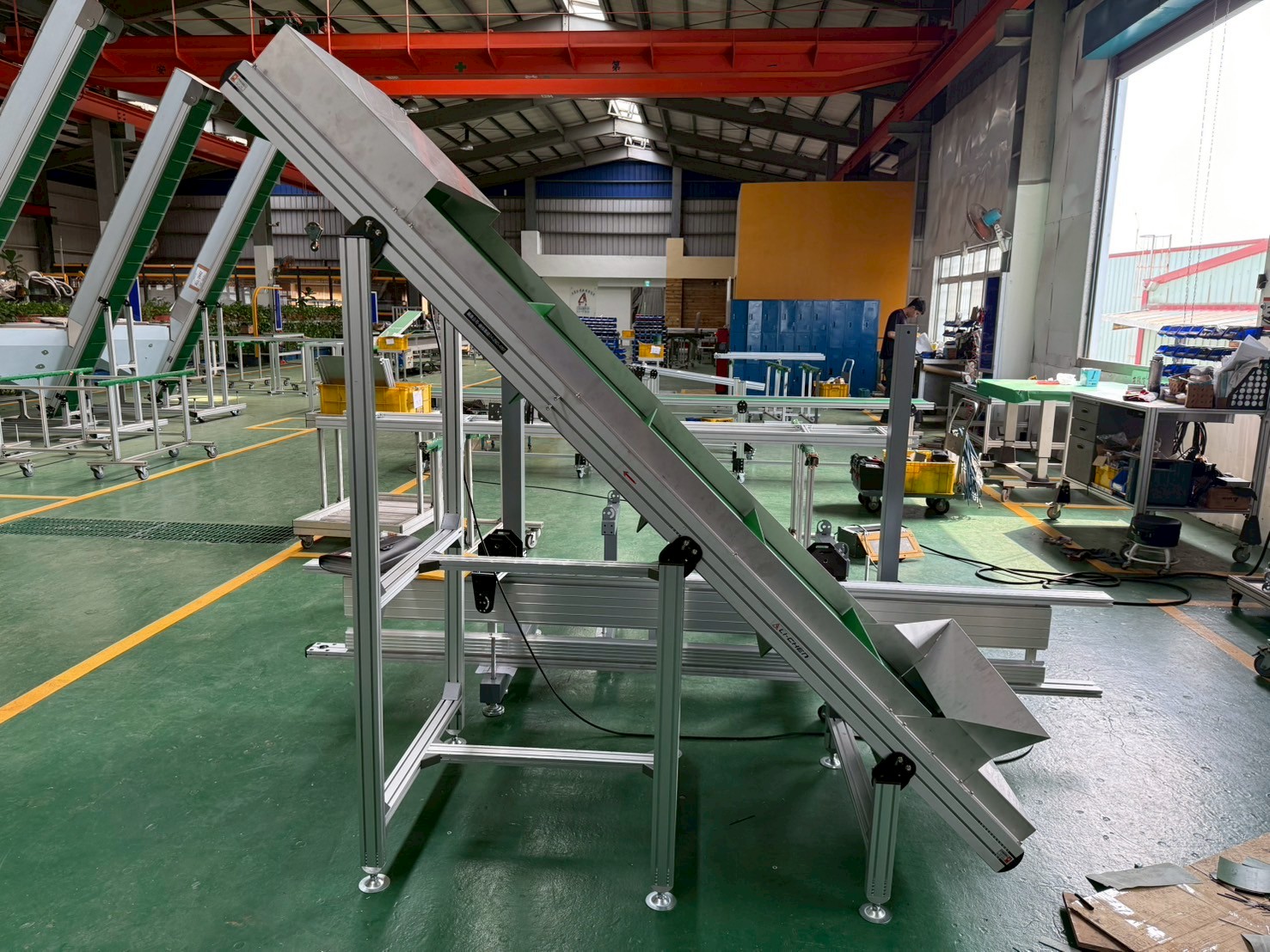 爬坡式輸送機專為跨樓層、跨空間的自動化輸送需求而設計。 透過穩定的傾斜輸送帶,產品能順利從低處輸送至高處, 大幅減少人工搬運,實現高效率的產線銜接。