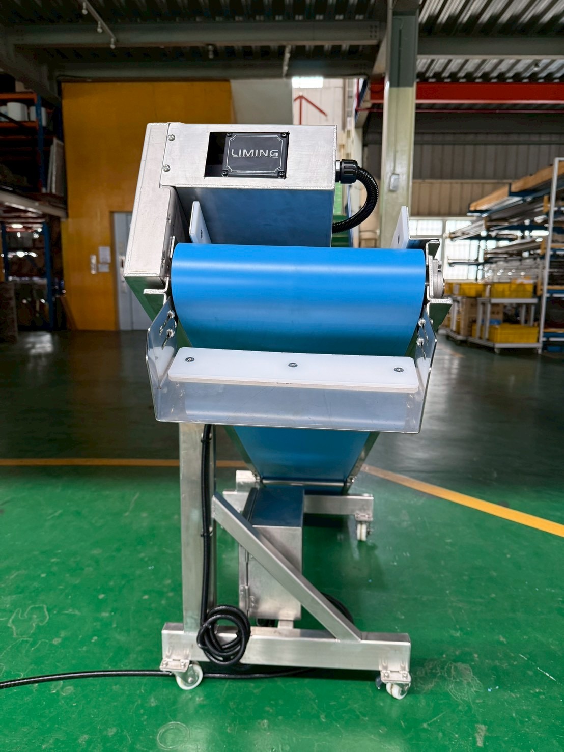 本套輸送設備專為食品廠芝麻粉製程打造,前端銜接碾碎機,後段連接震動過篩機,一次完成粉碎至篩選的完整流程,提升產線效率與穩定性。