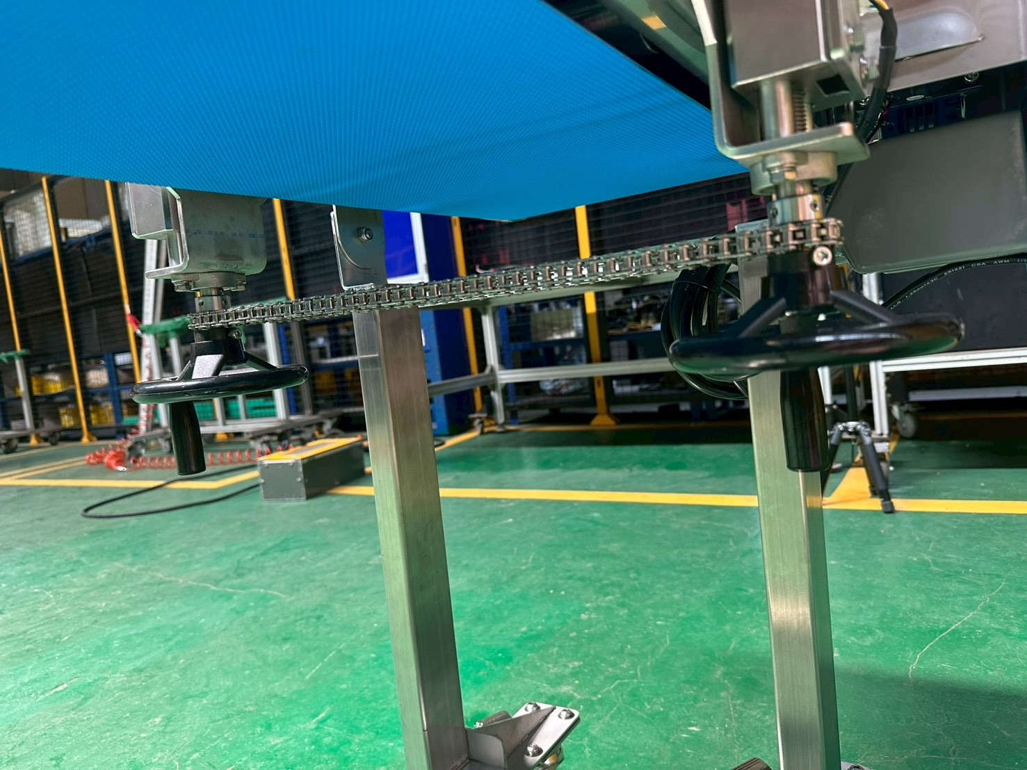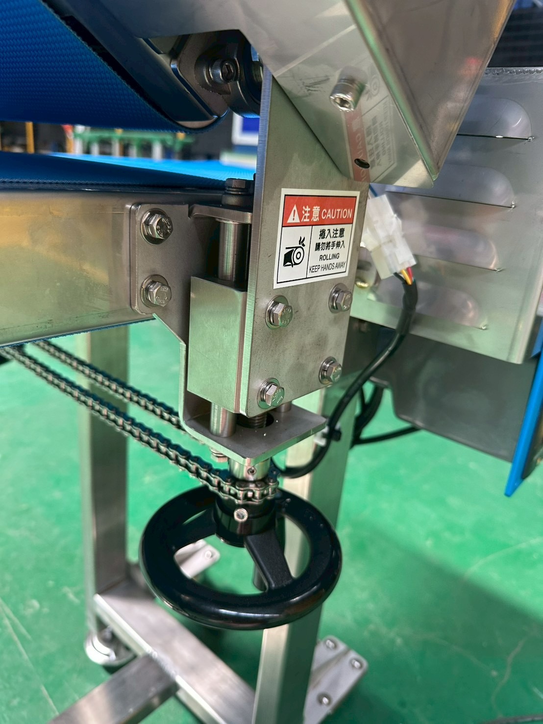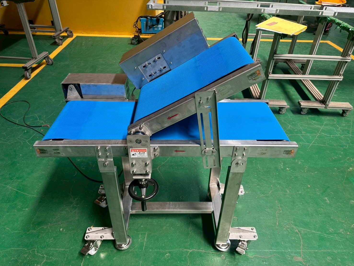 爬升輸送段具備手輪調整機構,可依產品特性調整角度與高度,精準控制壓平效果與輸送節奏。整體系統輸送速度可調整,能依產線需求靈活設定,達到穩定且高效率的連續作業。