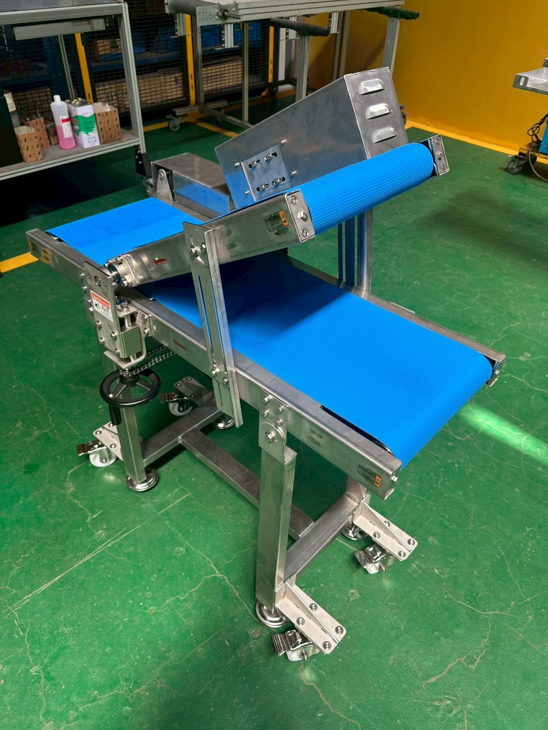 整機採用 SUS304 不鏽鋼板金製作,符合食品級衛生標準,並支援整機水洗作業,適用於高潔淨需求之食品加工環境。輸送帶選用食品級 PU 材質,具備止滑與防水特性,能有效避免袋裝產品在輸送與爬升過程中滑動或偏移。