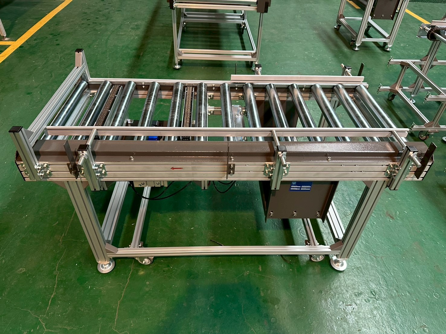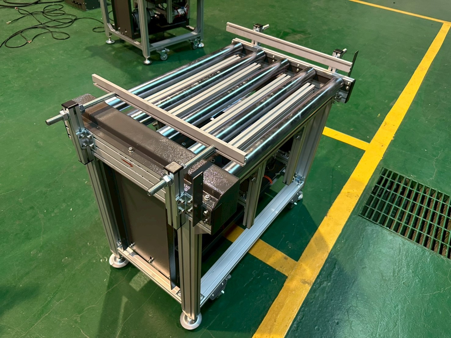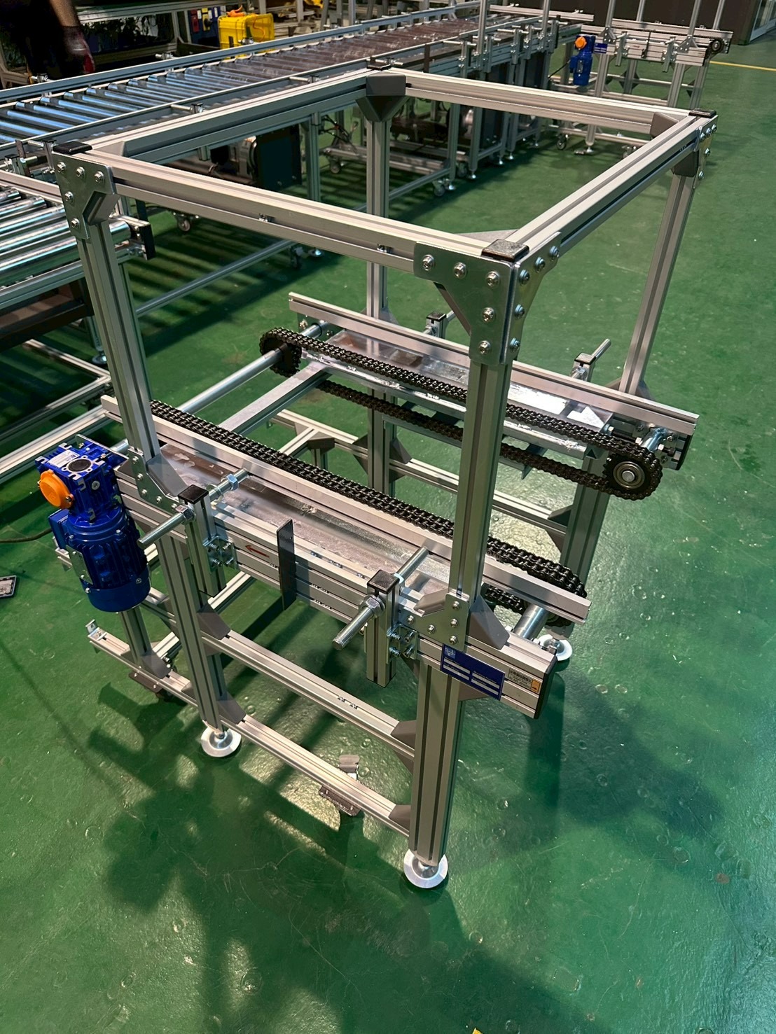 機身採用鋁擠型結構,搭配雙排鏈條與強制傳動滾筒設計,確保重載輸送時仍維持平穩運行。整線導入變頻調速系統,可依產能需求彈性調整速度,並與客戶控制系統進行整合。