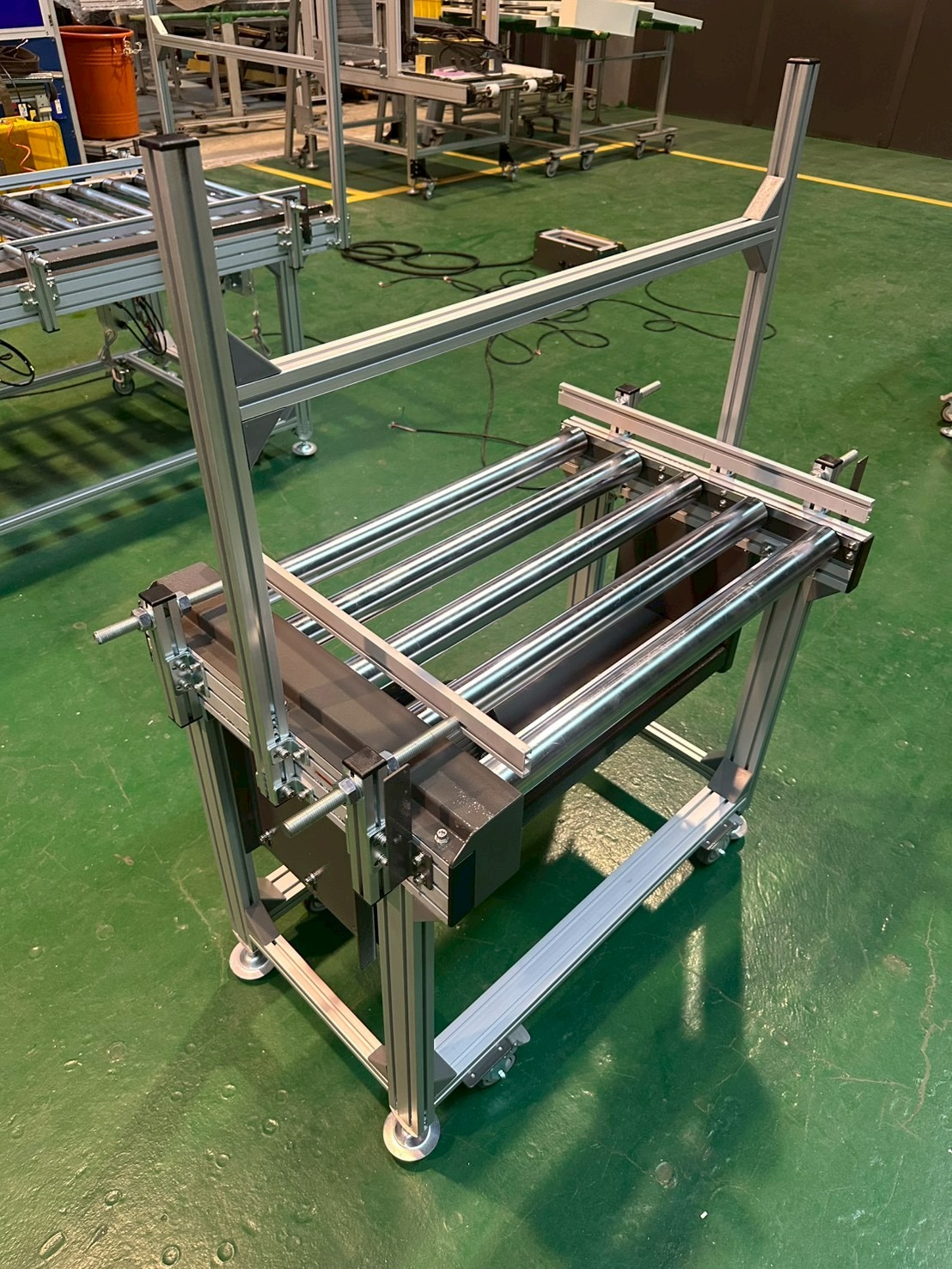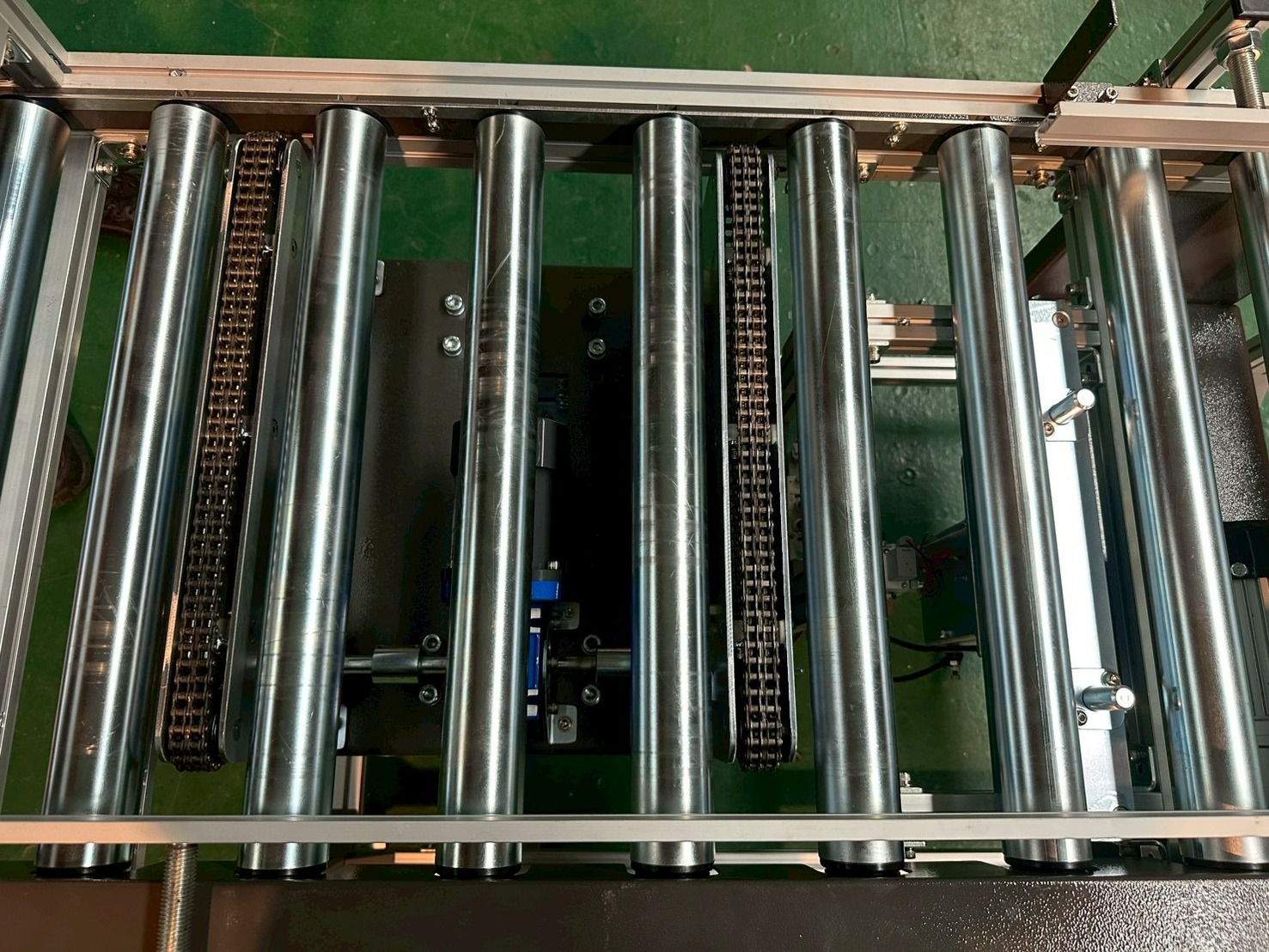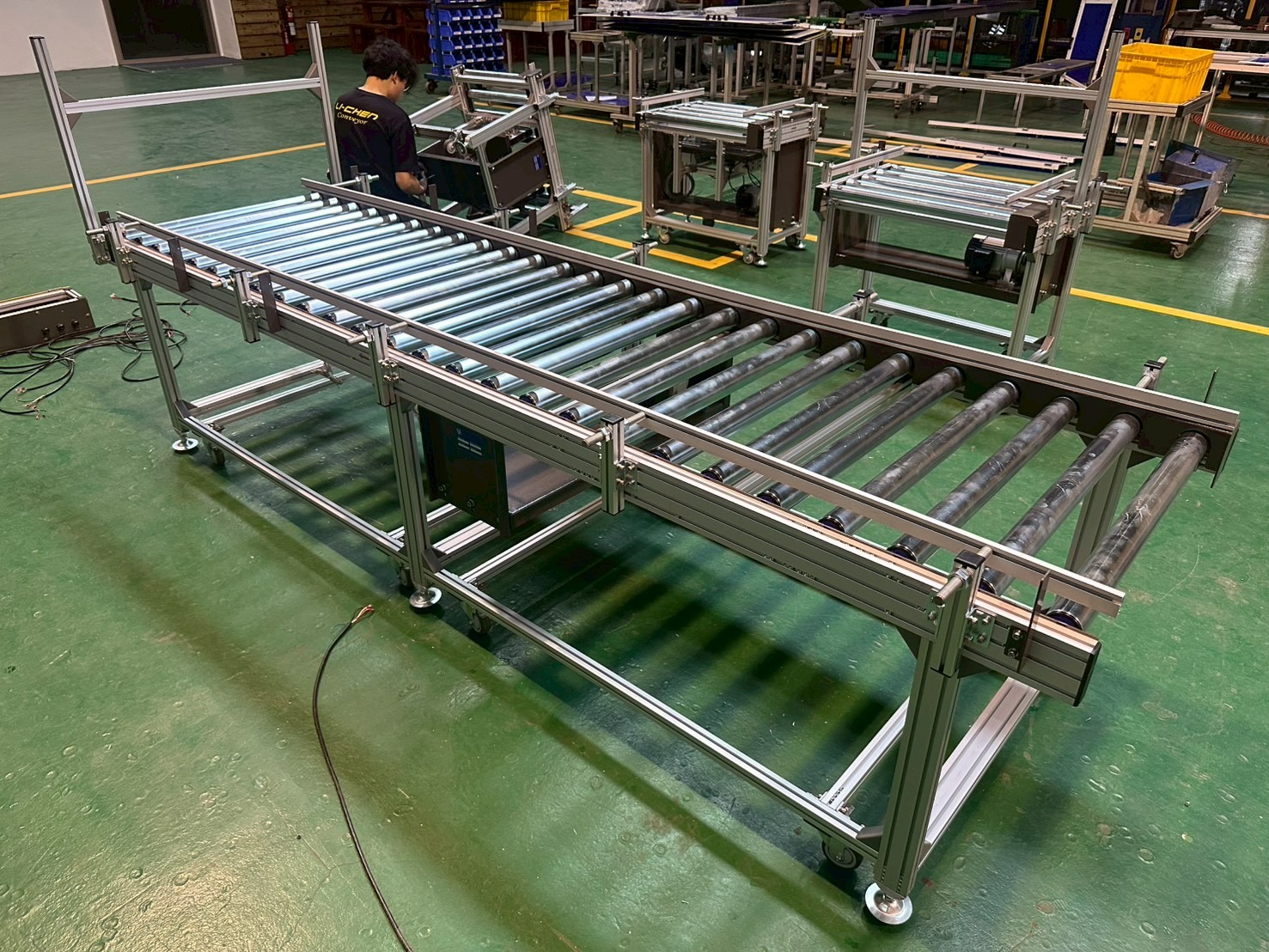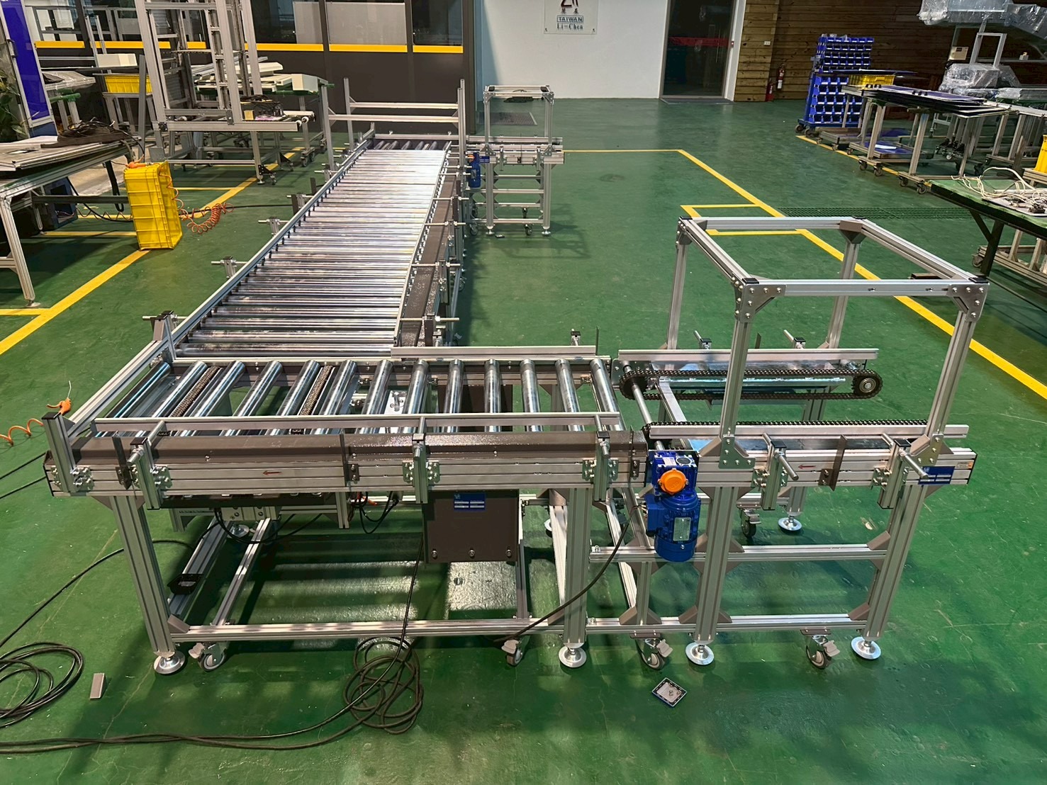 機身採用鋁擠型結構,搭配雙排鏈條與強制傳動滾筒設計,確保重載輸送時仍維持平穩運行。整線導入變頻調速系統,可依產能需求彈性調整速度,並與客戶控制系統進行整合。