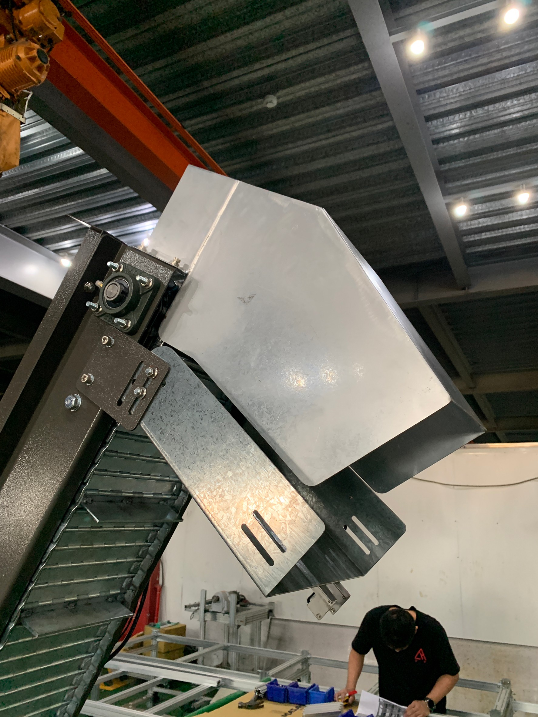 這禮拜要介紹的特殊機台主要適用於重型加工類產品運輸,此案為了運送鋁塊至熔爐,避免工作人員過於接近導致工安危險。業主導入這台爬坡式輸送機來取代人力投放的危險。重型輸送帶大部分使用橡膠皮帶來達到不易損壞的目的,由於機台靠近高溫環境, 使用麗晨的鋼板帶可以避免皮帶融化問題,加上儲料斗的氣壓缸推動也可以避免卡料。
